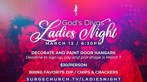 God’s Divas join us for our Ladies Night as we Decorate and Paint Door Hangers. The event will be held at the Church on Friday, March 12th at 6:30pm. It’s $30 per person, which includes your door hanger. Be sure to bring your favorite dip with chips or crackers.